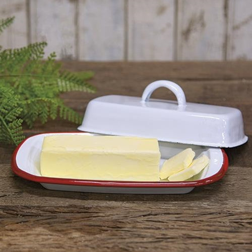 Red Rim Enamel Butter Dish is a white enamel dish with a vibrant red trim. Item is food, oven and dishwasher safe and measures 7" wide by 1.75" high.